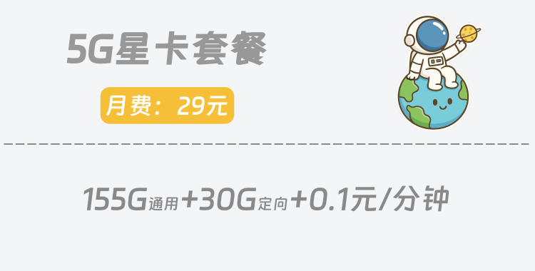 | 29元/月 | 155G通用+30G定向 | 0.1元/分钟,全国接听免费 | 首月免费,套餐内容按天折算 |